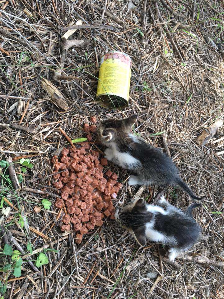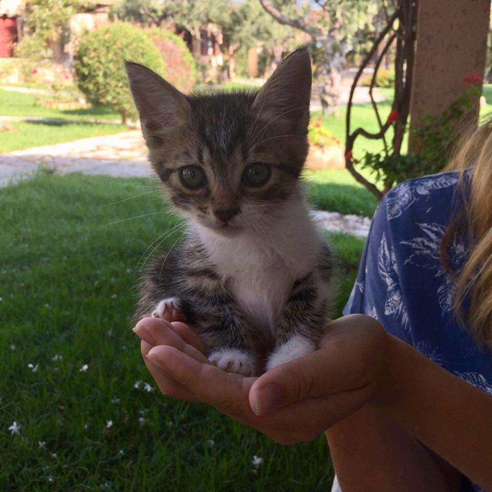 Kaum war der erste Urlaubstag vergangen und wir mit offenem Autofenster auf dem Rückweg in unser Hotel, übertönte ein uns wohlbekanntes Alarmgeräusch den Motor des Autos. „MIIIE-MIIIE-MIIIIIIE“ — oh Schreck, Kitten !!! Also angehalten, nochmal gelauscht … „MIIIIIIIE“ … Auto geparkt, alle drei raus und gesucht. Lange brauchtes es nicht, die Stimmchen waren laut genug (Motor war ja aus) und wir erblickten zwei kleine Kitten am Fuße der Straßenböschung in einem Olivenhain. Sie hatten uns schon erblickt und kamen hilfesuchend und schreiend auf uns zu. Also ganz schnell beide auf den Arm genommen und angstvoll geschaut. Sind da noch mehr? Als nächstes sahen wir die geöffnete Nassfutter-Dose. Aha, alles klar: Hier lebt keine Streunerkatze mit ihren Jungen im Hain, da hätten wir kein Kitten gehört oder gesehen. Streuner sind scheu. Die Dose war frisch entleert, das Futter war weder angetrocknet noch saßen irgendwelche Fliegen drauf. Also wurden die Kitten erst ein paar Minuten vor unserem Vorbeifahren dort abgesetzt und mit dem Futter versucht abzulenken, während man sich schnell wieder entfernte. Wahrscheinlich wurden wir sogar noch beobachtet, als wir anhielten. Immer noch wussten wir nicht, ob es zwei waren, oder mehr. Manchmal sind Kitten aus einem Wurf scheu, wenn sie so unvermittelt von der Mama getrennt werden und verstecken sich sofort im hohen Gras. Immerhin sind die kleinen Männer kaum älter als 6 Wochen, die Augen hatten immer noch das Babyblau. Wir setzten die Kleinen ans Futter, und haben uns etwas entfernt, falls da noch ein Geschwister sein würde. Aber auch nach einigem Warten haben wir weder etwas gehört noch gesehen und die Jungs kamen natürlich schon wieder angelaufen. Sie waren also definitiv auch Menschen gewöhnt. Die Fotos von den Kitten am Fressen sind auch in dieser Zeit entstanden.