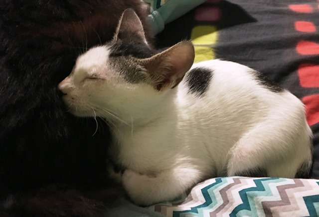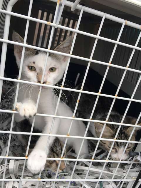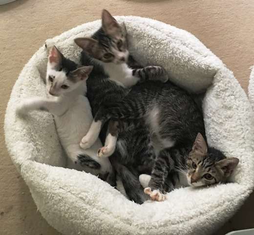 Was genau Hajo widerfahren ist, können wir nur vermuten. Der Tierarzt tippt auf einen hungrigen Fuchs oder einen größeren Hund, der sich den kleinen Kater „geschnappt“ hat, und zum Glück am Ende recht wenig Schaden anrichtete. Hajo wurde als Kitten von 5-6 Wochen bemerkt, da er nicht SO spielen konnte, wie seine Geschwister. Bei näherem Hinsehen erkannte die Familie, dass Hajo ein Hinterfuß fehlte und der Stumpen oberhalb des Knies noch roh war. Sie beratschlagten sich mit uns und packten den Kleinen kurzerhand in ihr Auto und fuhren ihn zu unserem Vet. Dort wurde er erstversorgt und konnte dann auf den wirklich allerletzten Pflegeplatz einer privaten Tierschützerin umziehen. Seine Wunde heilte und so konnte er bald schon mit den anderen Kitten auf der Pflegestelle herumtollen. Insbesondere Nikos und Giorgios hatten es ihm angetan, obwohl die beiden eine ganze Ecke größer waren.