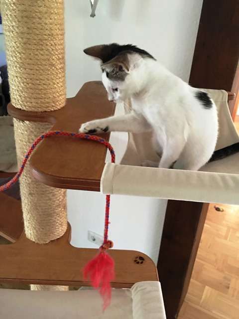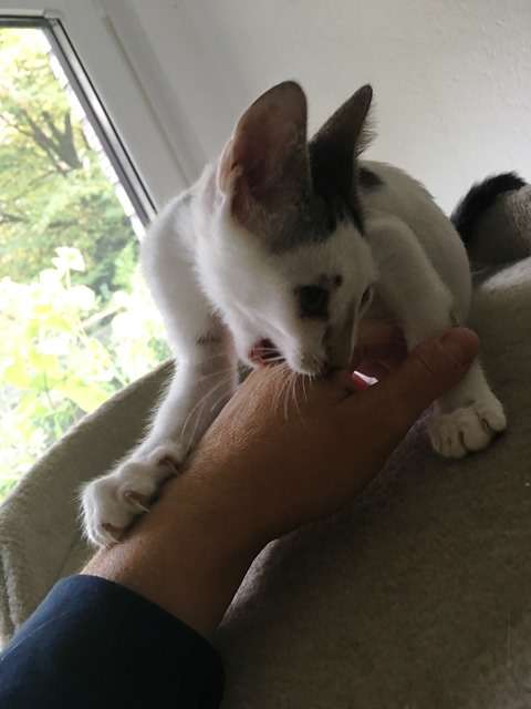Insofern suchen wir jetzt ganz fix das endgültige Zuhause für Hajo. Unnötig zu sagen, dass Zakynthos-Kitten wie er sozial und unkompliziert sind. Hajo spielt für sein Leben gerne mit anderen Katern, hat keine Angst vor größeren Kumpels obwohl er selbst noch keine 2 kg wiegt. Er flitzt die Kratzbäume und Treppen rauf und runter und wenn das halbe Beinchen nicht immer so in der Luft herumrudern würde, fiele sein Handicap gar nicht auf. Er würde sich sicher auch über einen ausbruchsicheren Garten freuen, in dem er toben kann und gleichzeitig vor Feinden geschützt, damit sich sein Kindheitstrauma nicht wiederholt.