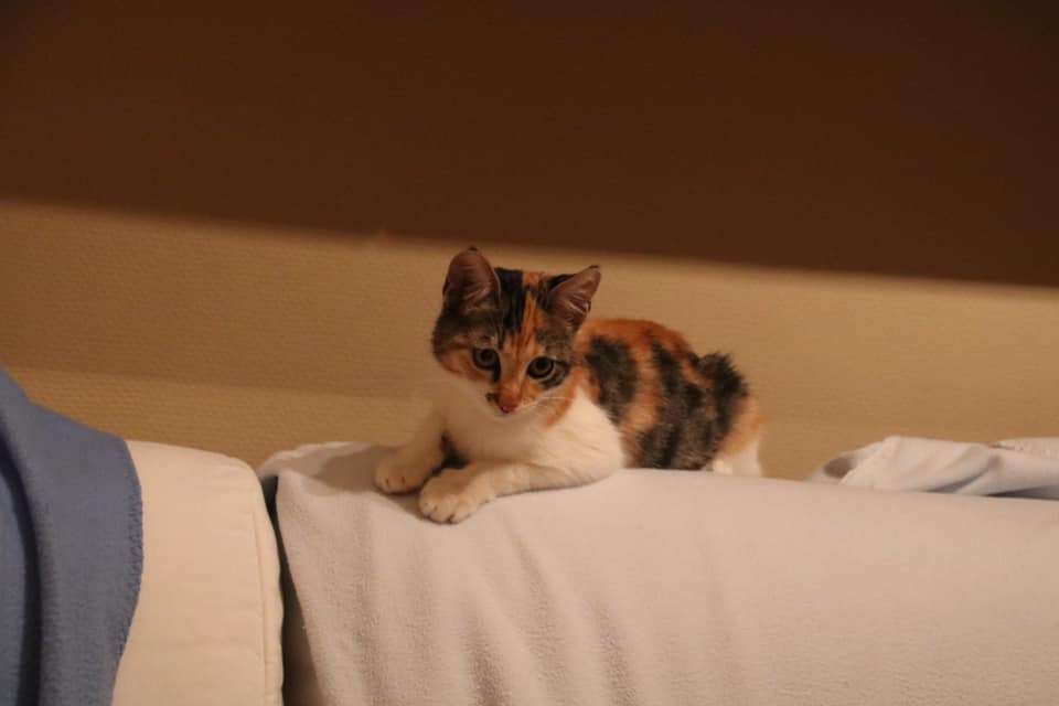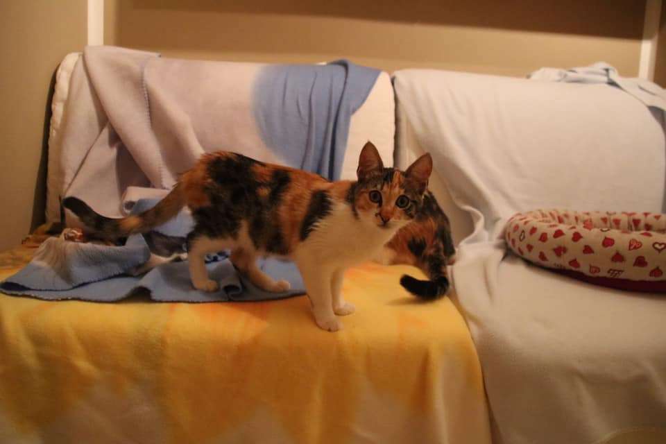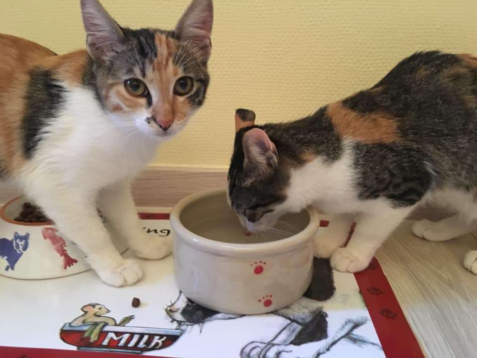 Die beiden dreifarbigen Schwestern wurden Ende Mai als winzige Kitten zusammen mit drei weiteren Geschwistern in einem Müllcontainer in Hermoupoulis auf Syros gefunden.
