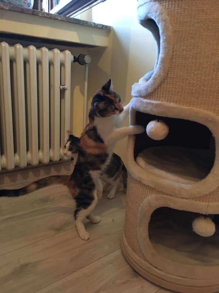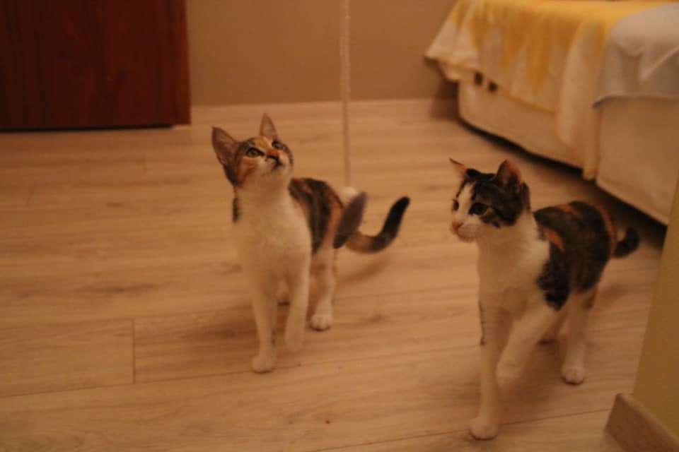 Eingeschnürt in eine Plastiktüte und entsorgt wie Abfall haben sie um ihr Leben geschrien, was zum Glück von einer nahebei wohnenden Hotelbesitzerin gehört wurde. Diese rettete die Kleinen vor dem drohenden Erstickungstod, aber damit waren sie ja längst nicht über den Berg. Viel zu klein und zu schwach mussten sie von einem katzenerfahrenen Ehepaar mit der Flasche großgezogen werden. Aber auch der Weg war von Frustration geprägt, denn drei Kitten verstarben trotz aller Fürsorge in den ersten Wochen. Die beiden Mädchen aber haben es geschafft und sind zu verspielten Katzen herangewachsen. Sie haben auf Syros in einer gemischten Gruppe gelebt und sind gut sozialisiert.