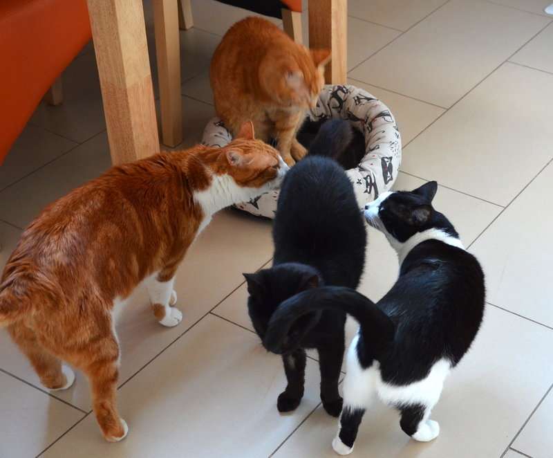 Wenn alle anderen Katzen gleichzeitig an ihm schnüffeln, ignoriert er das einfach und lässt es über sich ergehen.