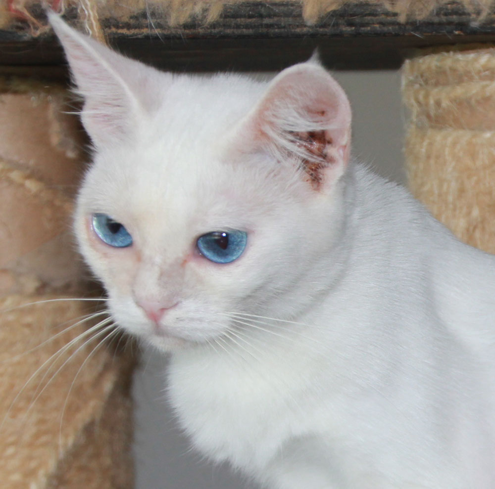 Lulu wurde von Marilyn gefunden als sie gerade mal drei Wochen alt war. Ihre Augen waren völlig entzündet und vereitert. Nach dem Marilyn ihr die Äuglein gesäubert hat, kamen zwei strahlend blaue Augen zum Vorschein. Leider haben die Bakterien ihr übriges getan, so dass Lulu durch ihre schönen blauen Augen nicht sehen kann, maximal Licht und Schatten kann sie erkennen.
