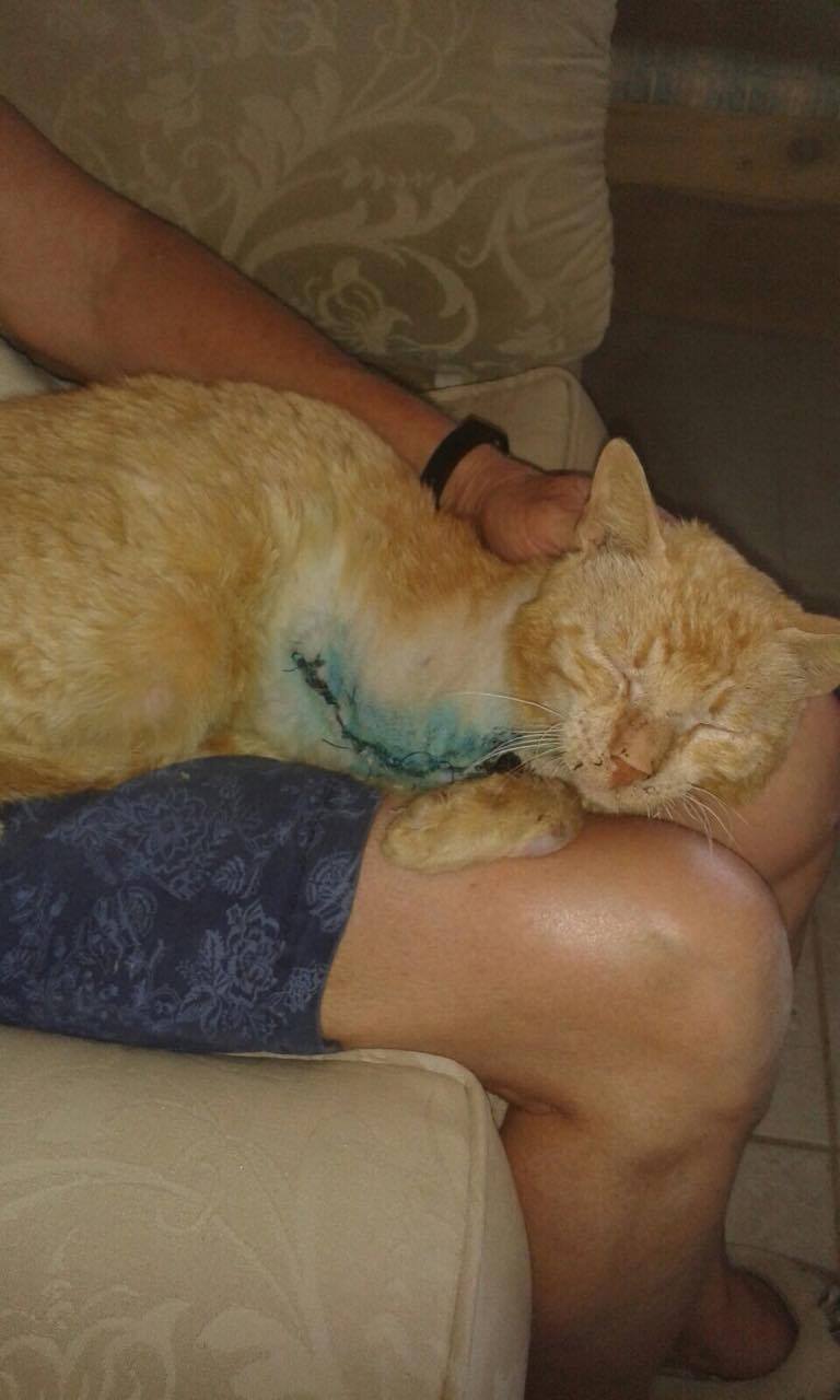 Weiter zu der verletzten Katze. Als wir dort ankommen, ist der rote Kater in einem wirklich schlechten Zustand, die Engländerin hat nicht übertrieben.