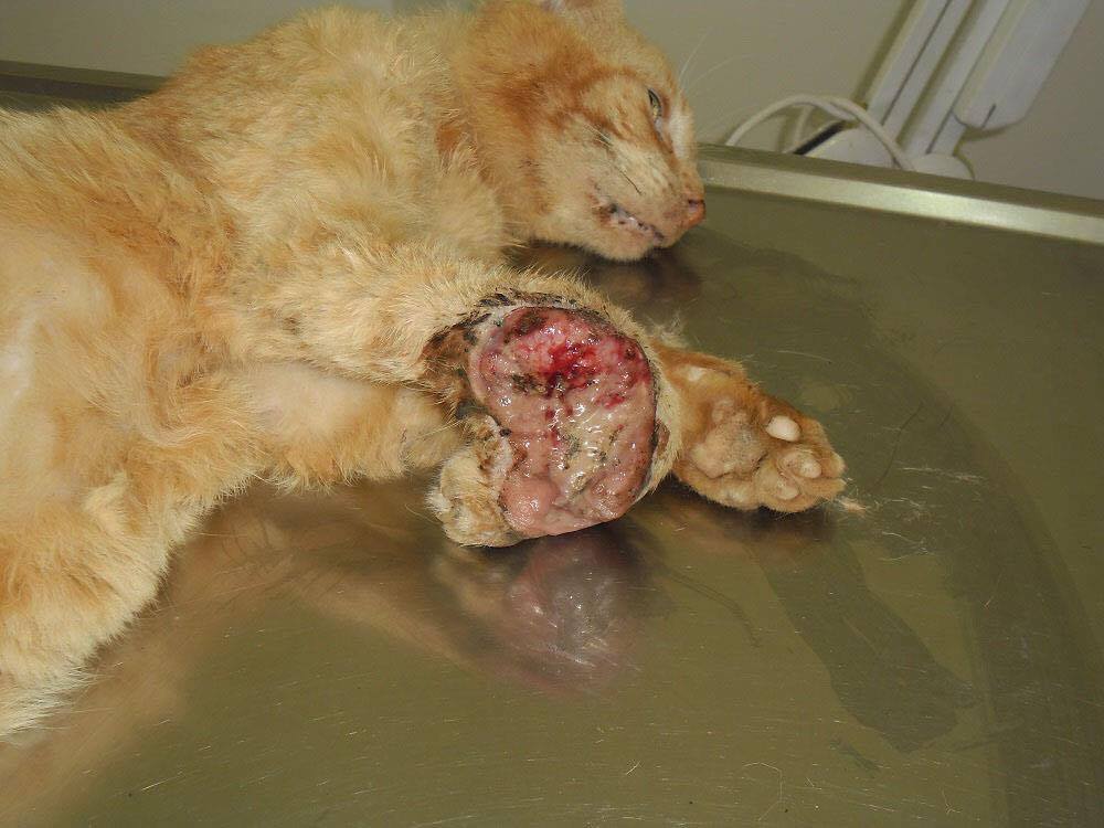 Unser erster Weg führt uns zum Tierarzt, der ziemlich entsetzt guckt. Der Kater bekommt eine Narkose, damit er untersucht werden kann und wehrt sich standhaft gegen das Einschlafen. Als er endlich untersucht werden kann, zeigt sich ein schreckliches Bild, die Wunde rechts ist noch grösser, als zuerst gedacht, sie blutet und ist infiziert. Das linke Vorderbein ist ebenfalls gebrochen, aber nicht so schlimm und schon am heilen. Zwei kleine Abszesse am Nacken und die Feststellung des TA, dass es sich hier um eine alte Katze handelt. Man muss allerdings anmerken, dass eine griechische unkastrierte Strassenkatze mit 6-7 Jahren schon fast ein biblisches Alter erreicht hat. Seine Nieren sind geschwollen und insgesamt ist er rappeldürr. Als allererstes lassen wir einen Bluttest machen, um festzustellen, ob er nicht FIV oder FeLV hat, beides ist GsD negativ, so dass wir weiter beraten, was zu tun ist. Wir kommen zu dem Schluss, dass er eine Chance verdient hat.